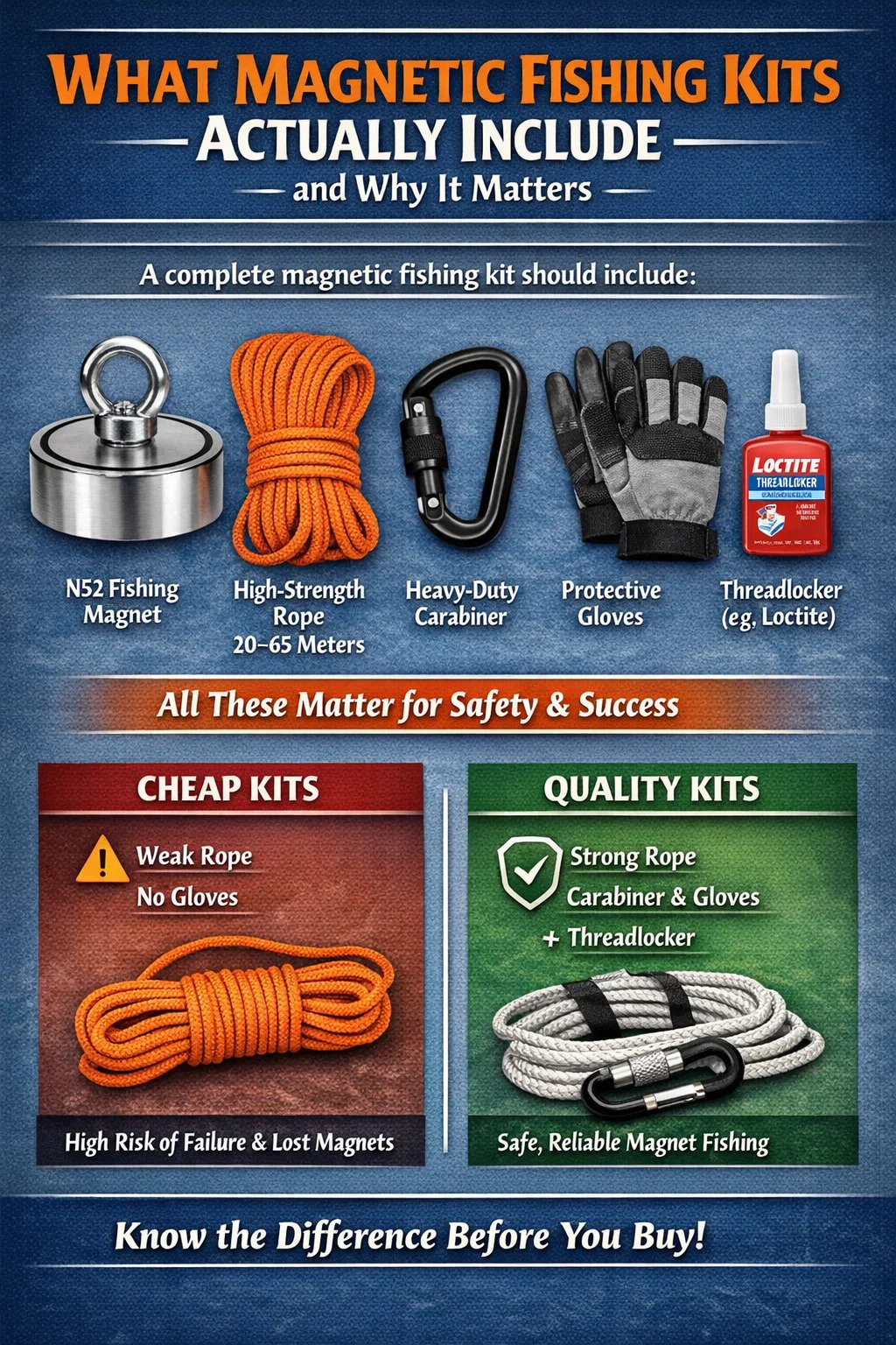 اگر به دنبال پاسخی سرراست هستید: یک کیت ماهیگیری مغناطیسی کامل شامل یک آهنربای ماهیگیری نئودیمیم، یک طناب با کشش بالا (معمولاً 20 تا 65 متر)، یک کارابین قفل کننده، دستکش های محافظ و اغلب یک ترکیب قفل کننده نخ مانند Loctite است. این مولفه ها با هم تعیین می کنند که آیا تجربه ماهیگیری با آهنربا مولد و ایمن است یا خسته کننده و خطرناک است. کیت های ارزان قیمتی که از دستکش صرف نظر می کنند یا از طناب درجه پایین استفاده می کنند، بیشترین تصادفات و آهنرباهای گم شده را در جوامع ماهیگیری آهنربای آنلاین تشکیل می دهند.
