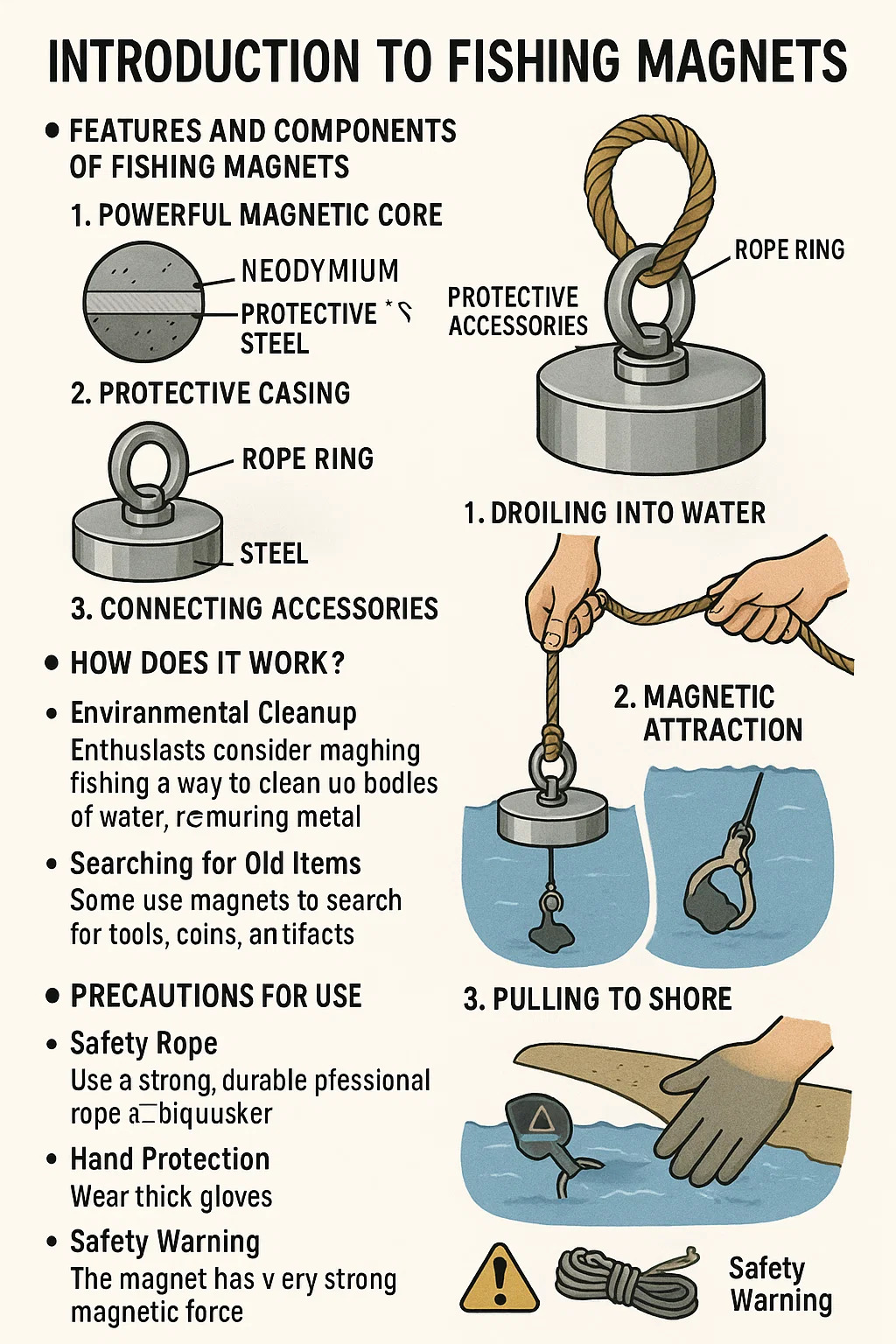 آهنربای ماهیگیری، همانطور که از نام آن پیداست، یک ابزار مغناطیسی قدرتمند است که برای "ماهیگیری" برای اجسام آهنی در کف آب یا در مکان های صعب العبور استفاده می شود. از نیروی مغناطیسی قوی برای جذب و بازیابی اجسام فلزی استفاده می کند و جایگزین قلاب ها و خطوط سنتی می شود.