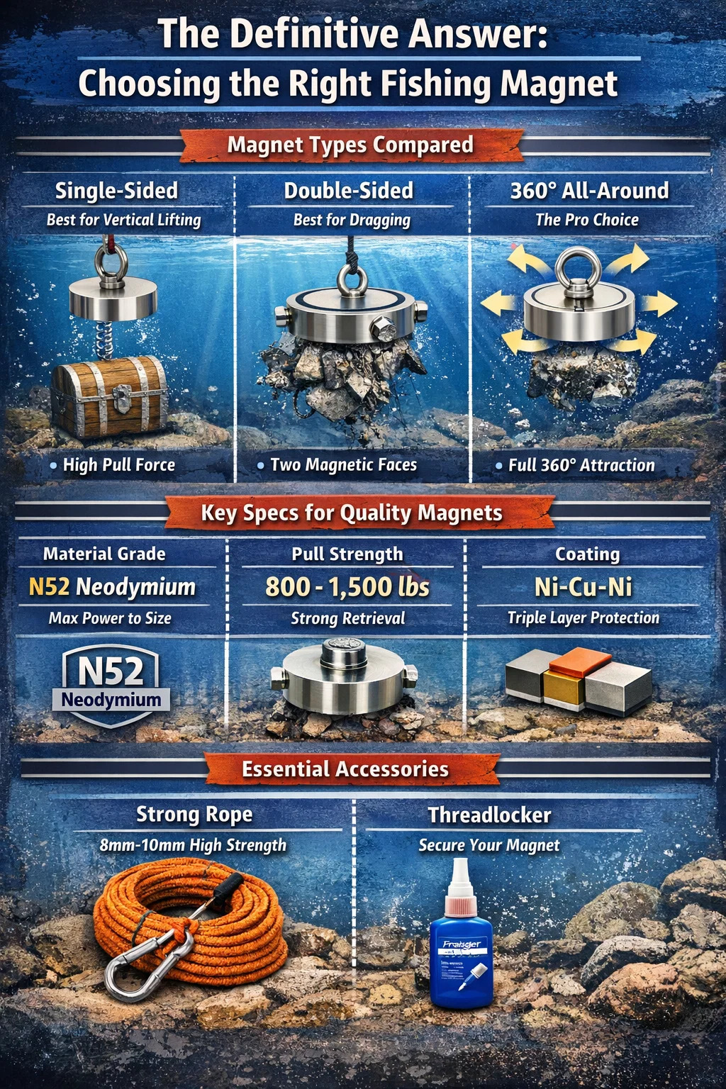 را آهنربای نئودیمیوم 360 درجه به طور گسترده ای بهترین انتخاب برای علاقه مندان جدی در نظر گرفته می شود زیرا کشش مغناطیسی را از هر زاویه ای ارائه می دهد و به طور قابل توجهی شانس گرفتن را افزایش می دهد. برای مبتدیان، الف آهنربای ماهیگیری دو طرفه بهترین تعادل بین هزینه، وزن و اثربخشی را فراهم می کند. مواد اصلی همیشه باید باشد نئودیمیم (NdFeB) ، به ویژه درجه N52، زیرا بالاترین نسبت توان به اندازه موجود در فناوری مدرن را ارائه می دهد.